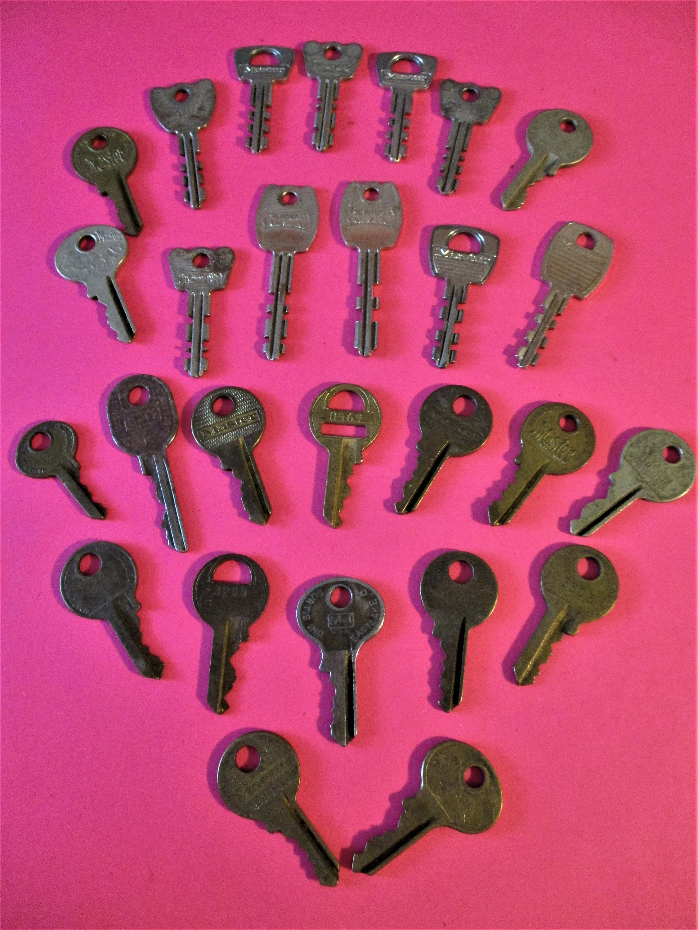 These keys measure from 2 1/4" down to 1 3/8". 12 are solid brass and the rest are steel. They are tarnished and the steel keys have some rusting. Different makers. Great for your collection, steampunk art, jewelry making and etc..